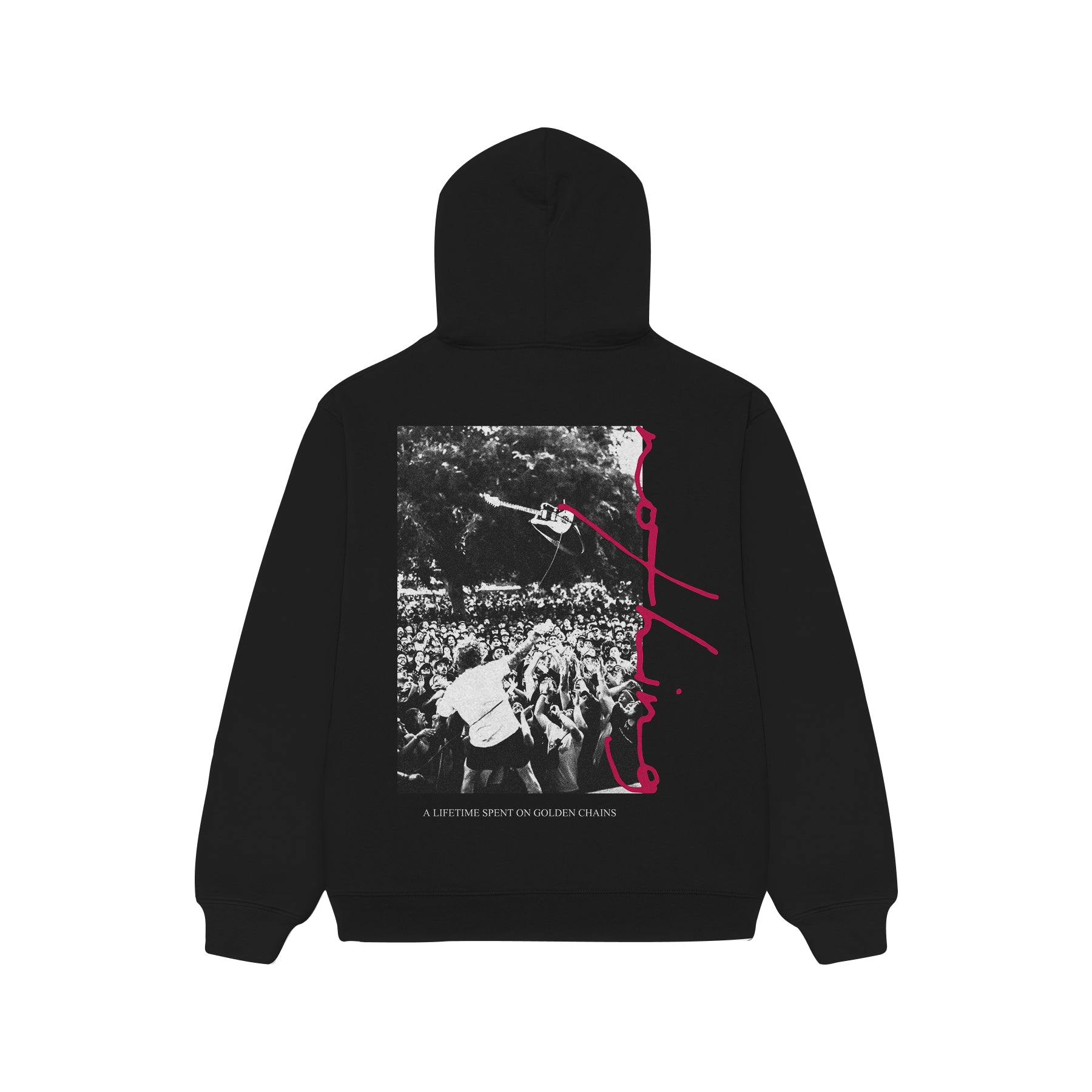 Screen printed on a black 80/20 ring-spun cotton/polyester 3-end fleece hoodie with an oversized fit.